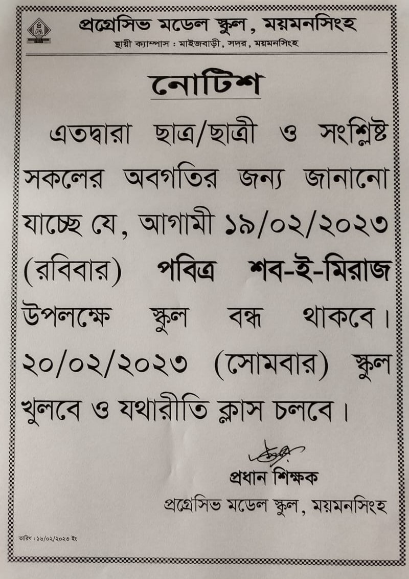 পবিত্র শব-ই-মিরাজ উপলক্ষে স্কুল বন্ধের নোটিশ